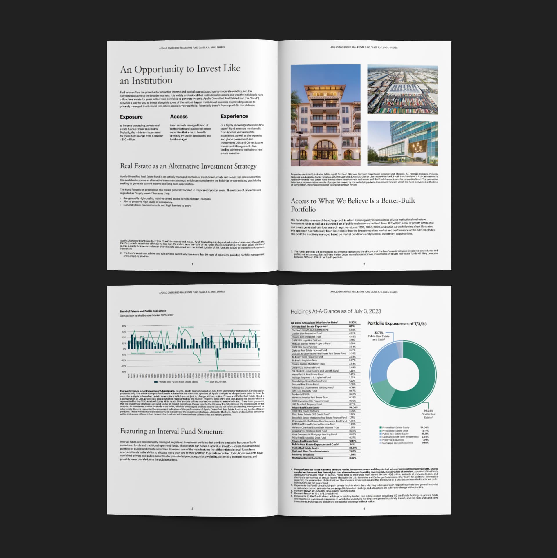I created marketing materials as a member of Apollo’s in-house creative team, designing product brochures, one-pagers, and sales materials. I worked within established brand guidelines, designing for clarity and professional presentation to support the wealth management sales team.